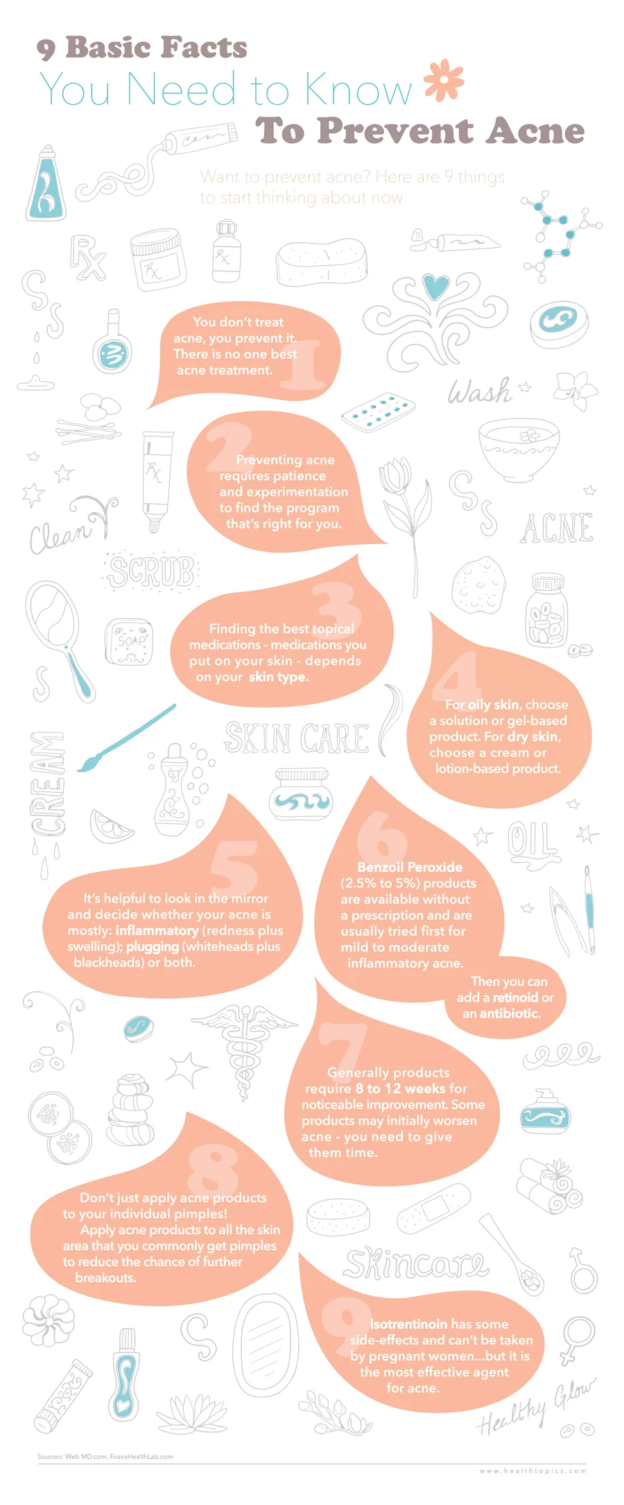 Informational illustration detailing acne causes, prevention, and treatments