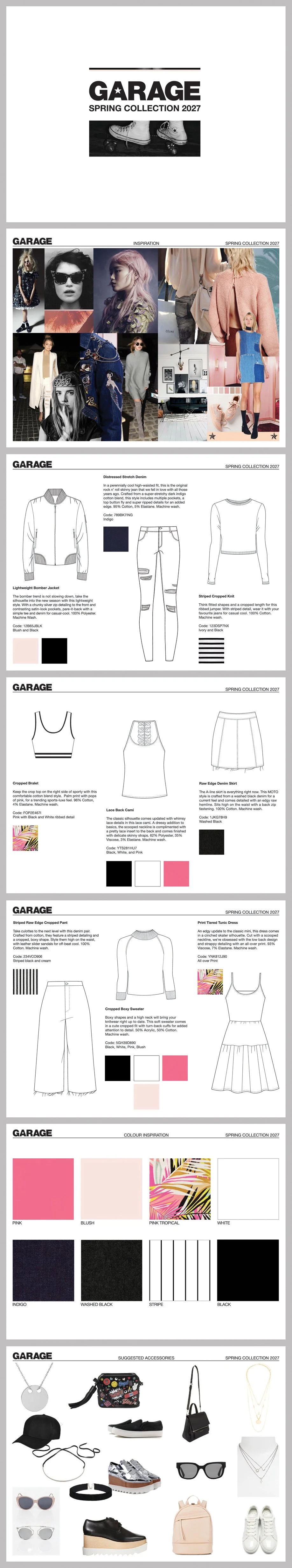 Fashion pack design; technical flats, mood board, colour board, inspiration, accessories